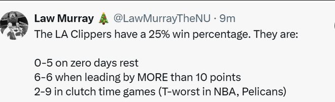对于快船目前的情况,快船随队记者Farbod Esnaashari写道:“快船队在关键时刻惨痛失利数可能是联盟第一。无论是篮板球争抢不力、失误过多,还是错失空位投篮机会,他们在下半场总是不断输球。这种情况如此频繁,以至于分析上半场的表现似乎变得毫无意义。”