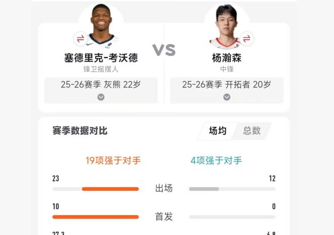 科沃德真的更好吗?目前看确实如此,22岁的他不仅坐稳灰熊首发小前锋位置,场均上场时间也已经达到27.3分钟。得分方面,科沃德场均13.4分妥妥的球队三当家水平,而杨瀚森场均2.5分,只能挥舞毛巾看守饮水机。二人数据横向对比,科沃德有19项数据强于杨瀚森,而杨瀚森只在盖帽和失误两项数据强于科沃德,哪怕小白球迷都能看出二人根本不是一个量级的球员。
