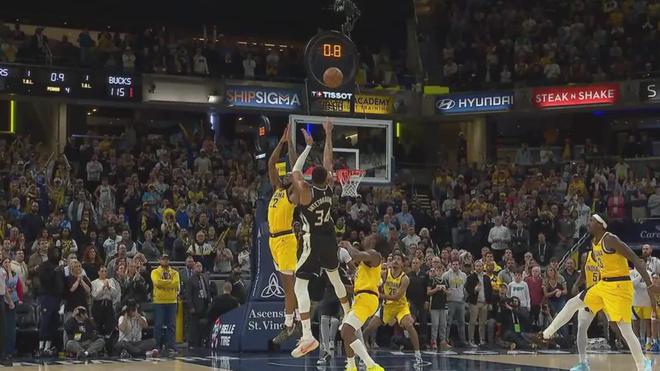 此时字母哥展现了球队老大的气概,读秒阶段自己持球进攻,迎着步行者的防守出手绝杀中投。